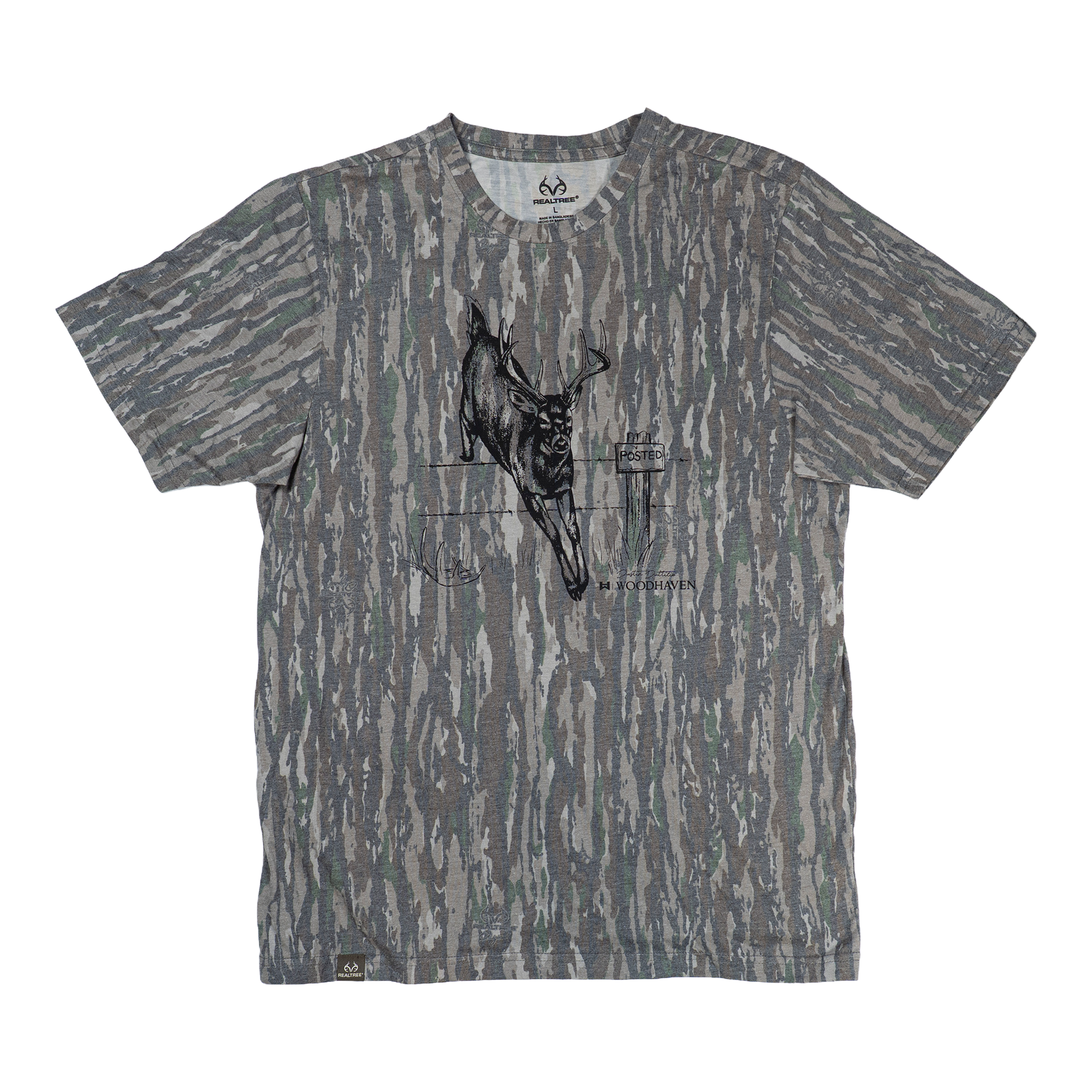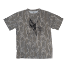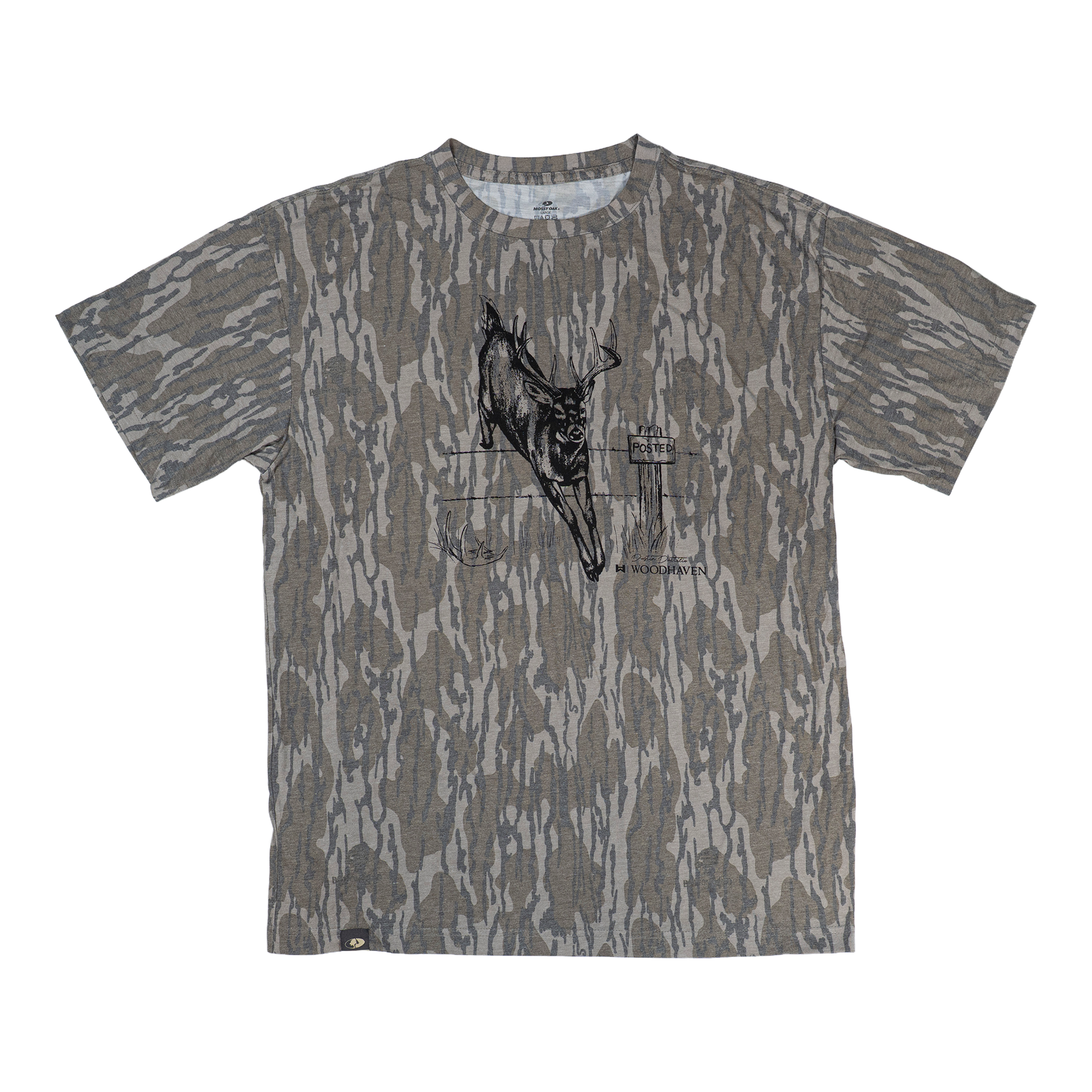 A whitetail buck caught clearing a fence. Over the Line is printed on a 50% Polyester / 25% Cotton / 25% Rayon tri-blend that’s soft, durable, and built for comfort. Set against one of two timeless patterns: Mossy Oak® Original Bottomland or Realtree®Original, the scene is brought to life with original artwork by wildlife artist Dustin Dattilio.