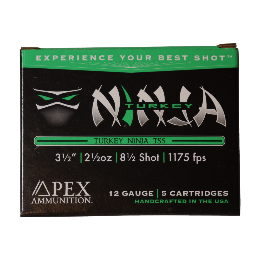 The APEX “Turkey Ninja” line will feature the #8.5 TSS shot and will be available for 3 & 3 1/2 inch 12 gauge, 20 Gauge and 28 Gauge. .410 ammunition will also be offered as well within the “Turkey Ninja” line but will be loaded with a 7/8oz load of #9.5 TSS shot. The heaviest .410 payload ever introduced in the industry.